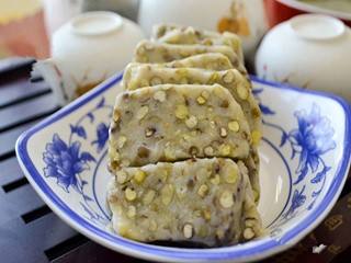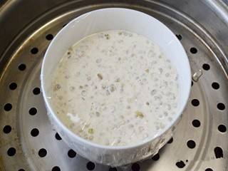 绿豆倒入锅内,加入清水,中火,煮至熟烂,捞出绿豆,加入白糖,搅拌均匀,倒入糯米,搅拌均匀,盖上保鲜膜,扎上小孔,放入蒸锅中,蒸熟。