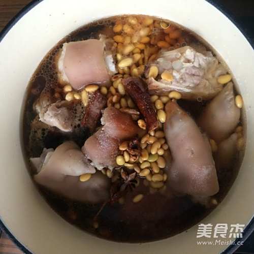 5加入盐,老抽,八角,桂皮,冰糖,倒入水,没过猪蹄。