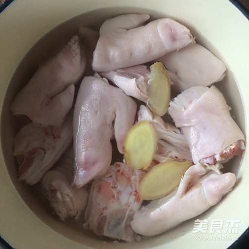 2猪蹄切小块,冷水下锅,放几片姜片,可以去腥味,用大火煮去猪蹄的血水,温水冲洗干净。