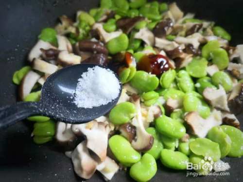 加入蚕豆米和香菇块翻炒片刻,调入小半勺盐,翻炒1分钟出锅。