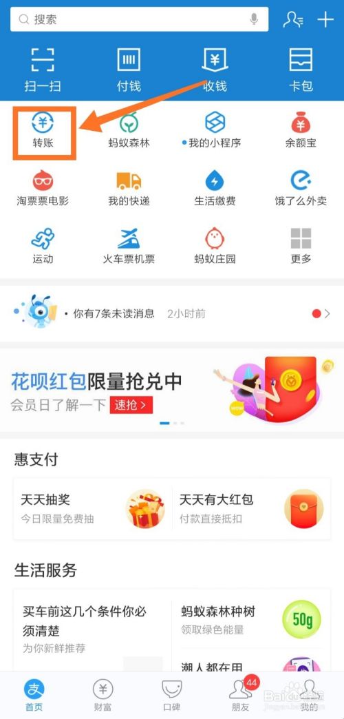 进入“支付宝”界面,点击箭头处的“转账”按钮。