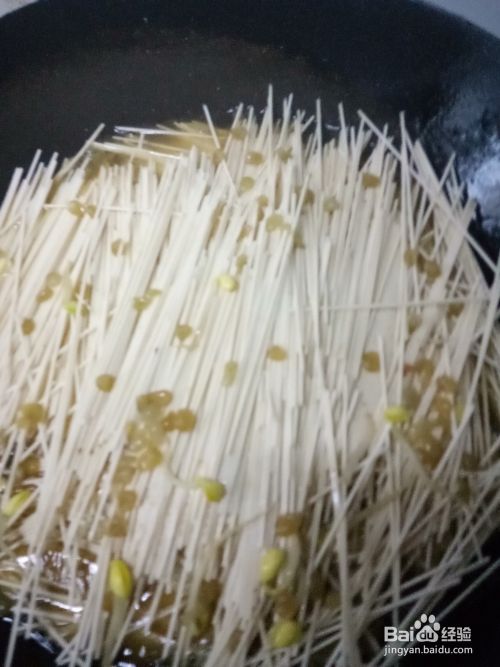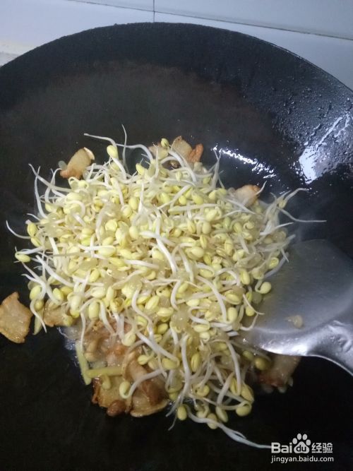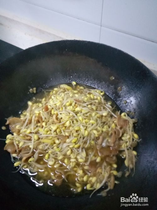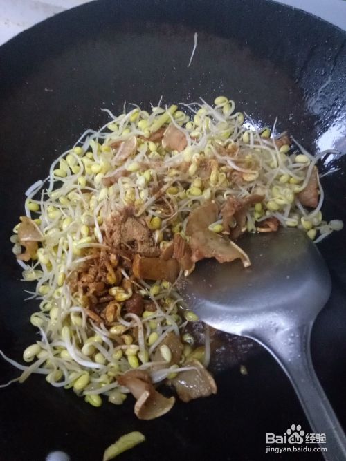 炒锅内加入一点油,油温升起后倒入五花肉片,翻炒出油后炸香姜丝,接着倒入豆芽翻炒几下后加入适量的盐、2勺生抽、1勺生抽翻炒均匀后加入适量的清水。