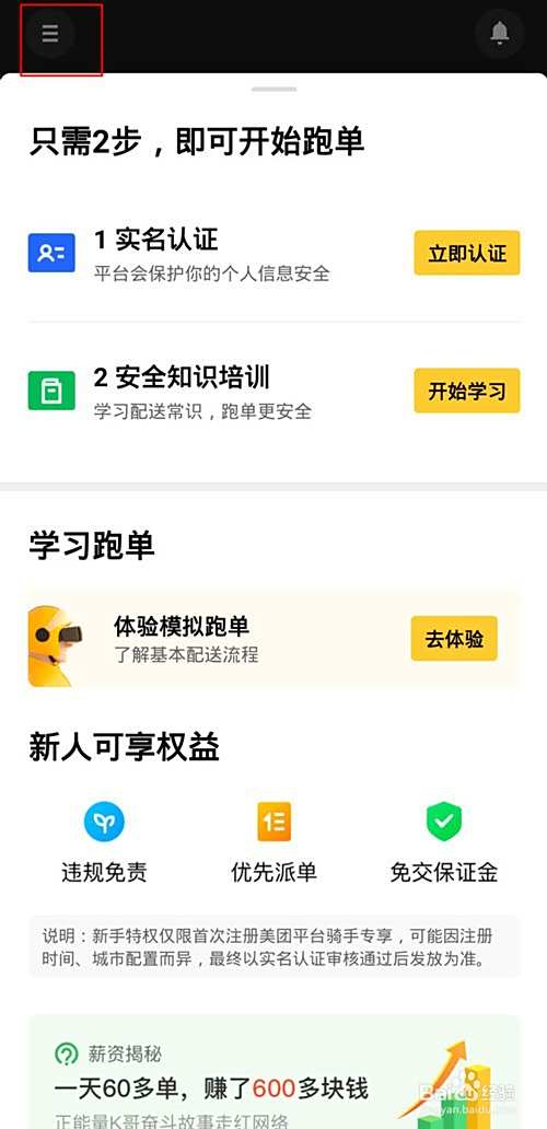 1、登录美团众包app,点击左上角三横图标进入美团众包大厅。