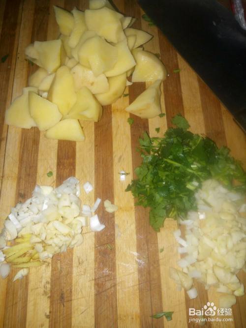 鸡翅腌制中…… 把其他材料切好备用 土豆切成小块易入味 葱蒜切成末,不爱吃姜的把姜切成丝或片这样放到菜里容易挑出来,把葱姜分成两份 香菜洗好切末