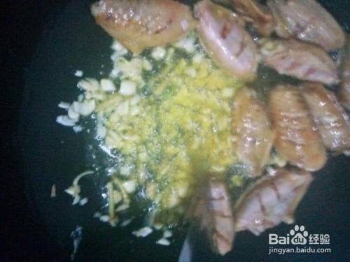 先加入葱姜蒜爆香,加入腌制好的鸡翅,煎炒至金黄色,注意掌握火候,根据锅不同可以适量减小火,不要糊了