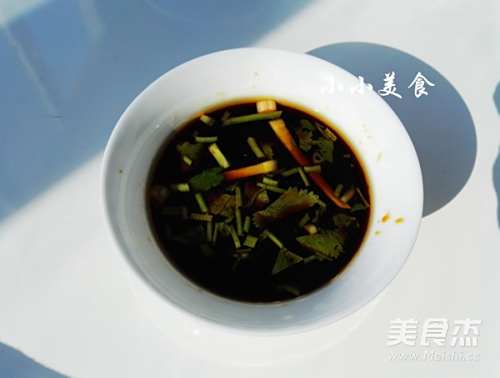 1取一碗:放上葱花,青蒜、姜丝,滴些香油,胡椒粉,陈醋,混合均匀