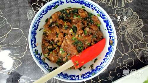 3猪肉用机绞成肉馅,加入花椒水,搅拌到肉馅把水吸收完再添水,再按顺时针方向搅拌。加入姜葱末、少许酱油搅拌匀;加入盐搅拌匀