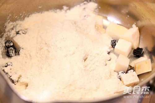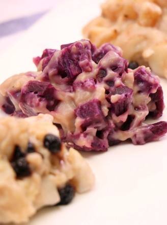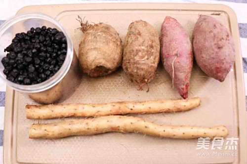 1原料:紫薯、淮山药、芋头、蓝莓、面粉、水、糖粉(或者砂糖)