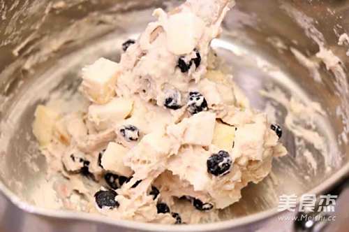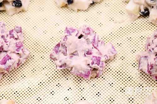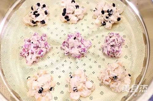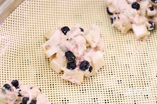5.接下来以制作芋头蓝莓口味的小馒头为例,先把芋头丁和蓝莓干放到合适的容器中。