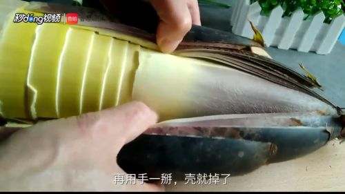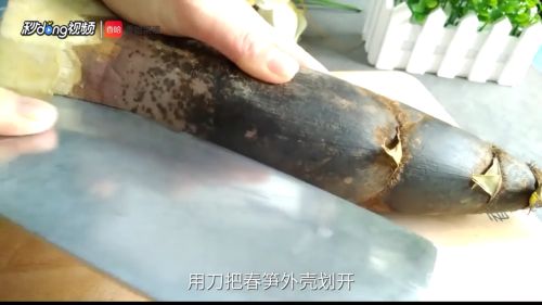 1用刀把春笋外壳划开。