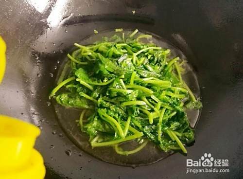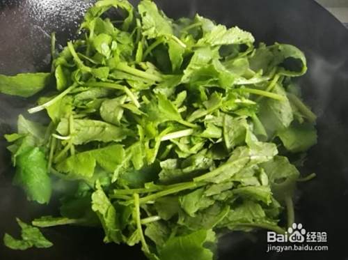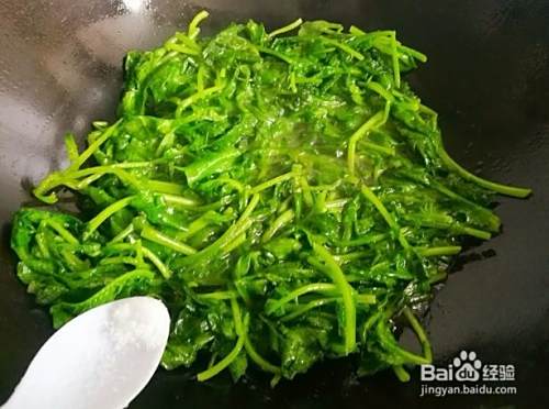 大火迅速翻炒,很快萝卜缨就变软了,加入适量食盐调味。
