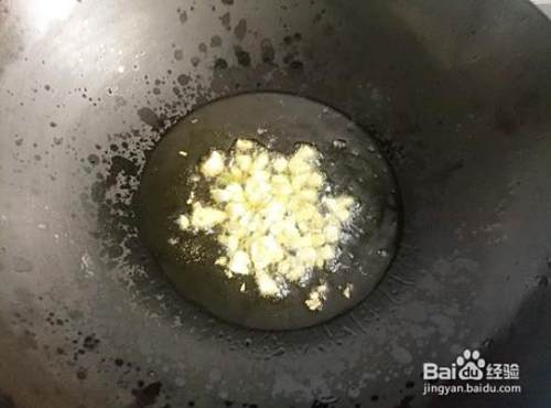 蒜瓣去皮切碎,铁锅中倒入花生油,将油烧至七成热以后,加入蒜瓣爆香。