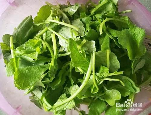 萝卜缨去除根部,摘洗干净后,放入镂空的篮子里控水备用。