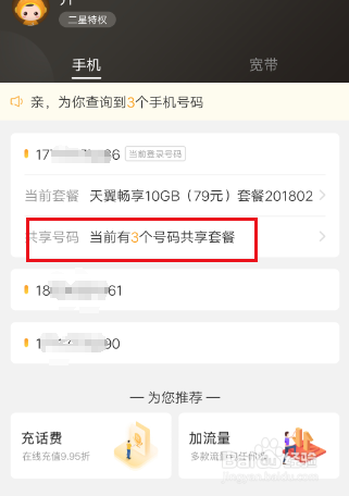 进入后,可在看到共享号码当前有3个号码共享套餐,点击进入。