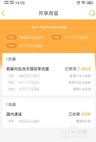 进入后,所有副卡使用套餐内流量信息、通话信息都可以看到。