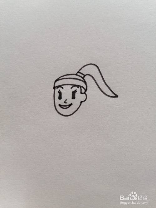 首先在纸上画出女生的头,头上画一束马尾,下面画出她的上半身和紧身衣服