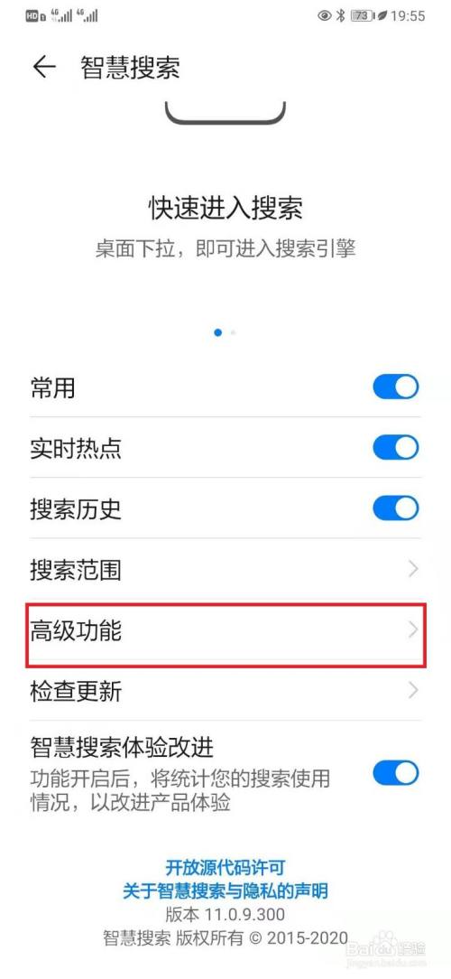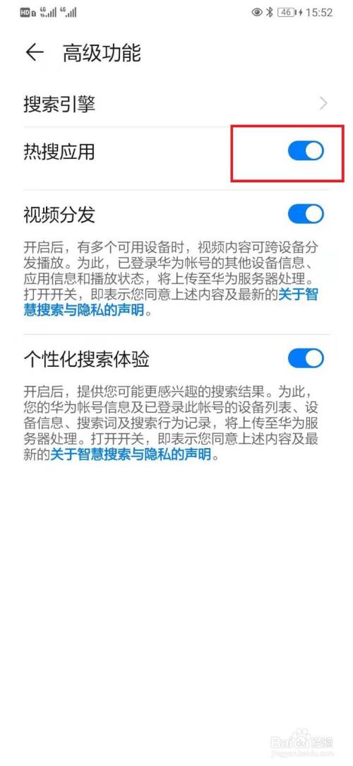 进入高级功能设置页面,点击关闭【热搜应用】开关即可。如下图所示。