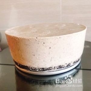 奥利奥饼干碎90g(家里没有现成碎碎,我是带着儿子玩,动手掰开刮掉中间夹心的),这90g做饼底。去夹心后放保鲜袋用擀面杖压碎,尽量细一点,然后45g黄油微波炉叮化,跟90g饼干碎觉拌匀,放六寸模具底部,用勺子压平,冷藏待用