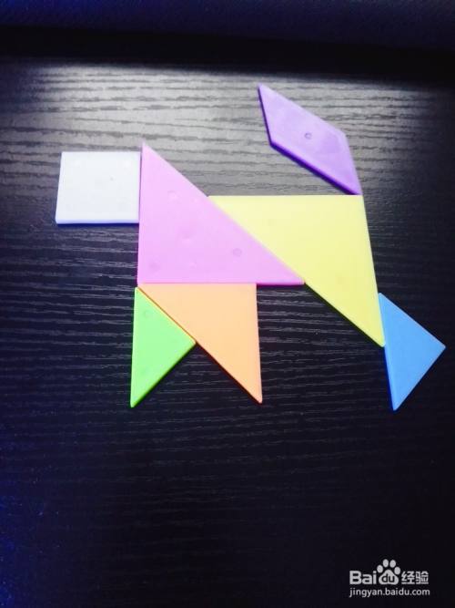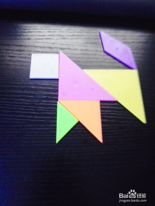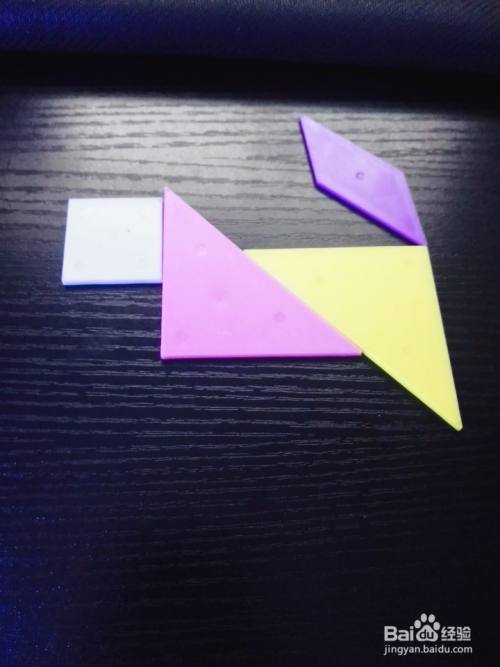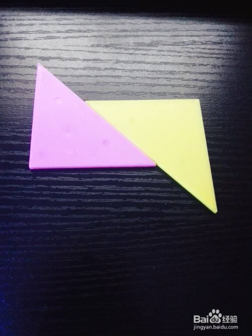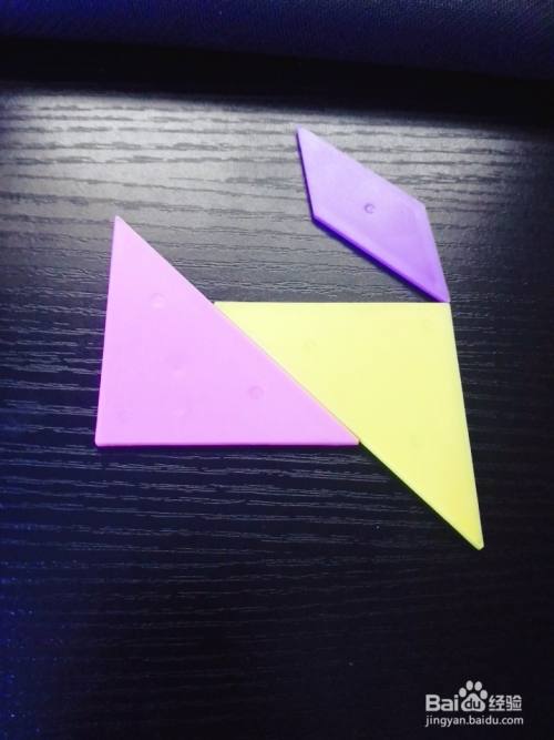 拿出一个紫色平行四边形板放在黄色大号三角形板的上面,如图所示。