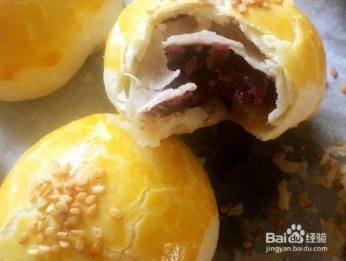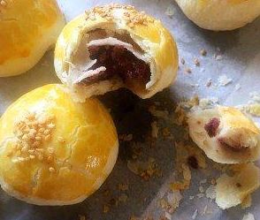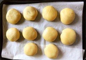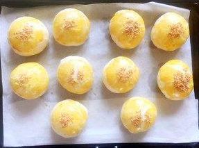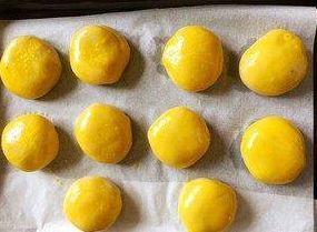 包好封口朝下,烤盘铺上硅油纸,把包好的红豆酥整齐放去烤盘上。