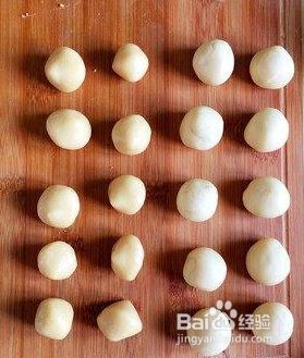 水油皮和油酥皮分别分成十个小剂子,左边油酥剂子,右边水油皮剂子
