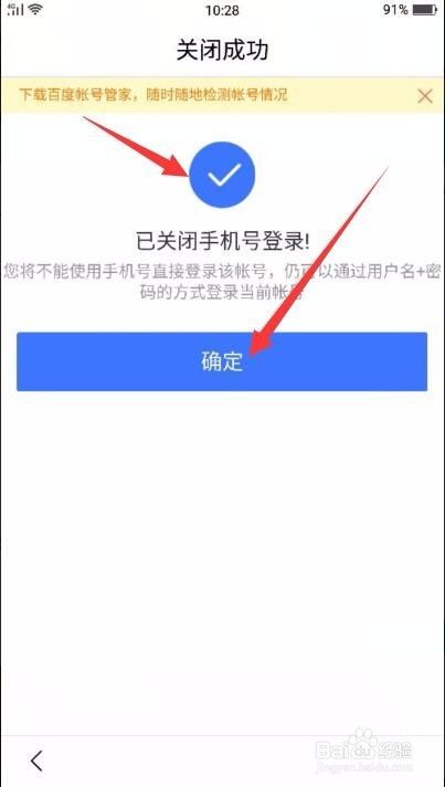 【已关闭手机号登录】;点击【确定】;我的理解是,手机号登录百度相当于手机号作为用户名使用,用户名是唯一的,当然不能继续注册,关闭手机号登录就相当于关闭作为用户名的功能。