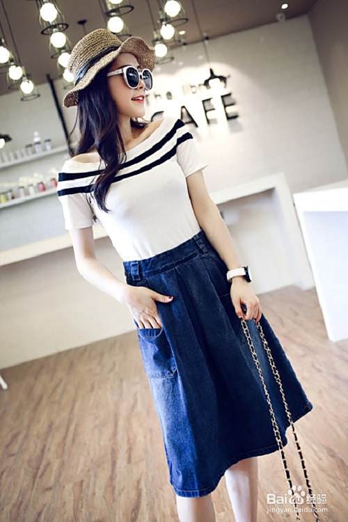 白色一字领T恤+牛仔中裙