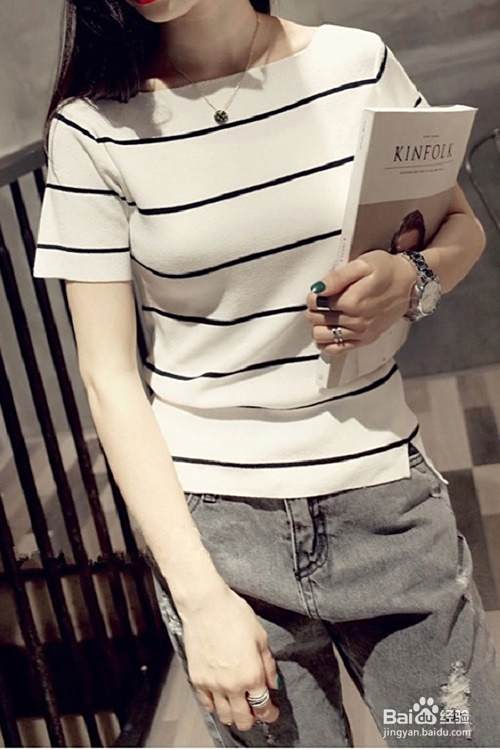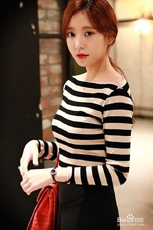 条纹的简单搭配原则就是,挑选条纹中的一种颜色进行搭配,比如模特就搭配了黑色的裤子,也可以搭配白色的下装。比如白色紧身打底裤、白色西装短裤或者长裤,白色半身A字裙、白色直筒裙等都很适合这件T恤的风格。根据下半身不同的搭配选择鞋子,可选高跟鞋、牛津鞋、帆布鞋。适合几乎一切非正式场合。