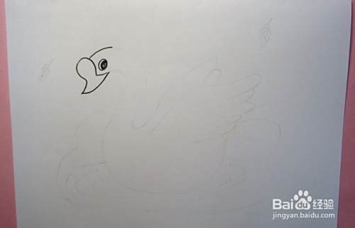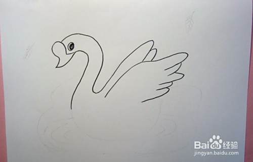 用铅笔在白纸上画出美丽的小天鹅草稿,用黑色的彩色笔画出美丽的小天鹅的头和眼睛、嘴巴的图形出来,如下图所示。
