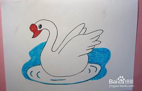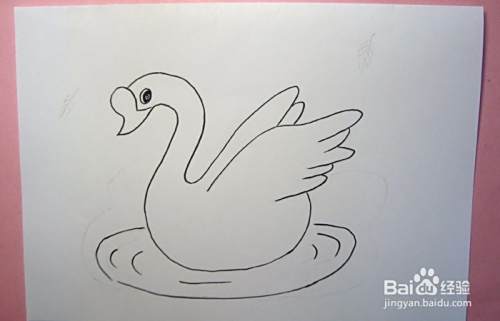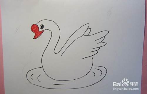 然后,用黑色彩色笔画出美丽的小天鹅身体的部分,并画出水面和水波纹,如下图所示。