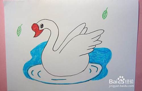 最后,用绿色水彩笔给美丽的小天鹅的背景上画出两片掉落的树叶,使美丽的小天鹅的形象更加生动了,如下图所示。大家按照步骤也来画画吧。