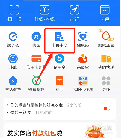 在支付宝的首页,点击市民中心。