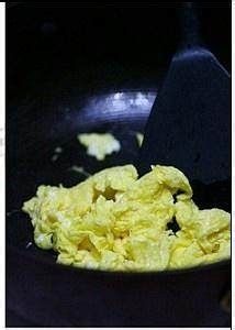 锅烧热后,倒入油,将蛋液倒入锅中炒至凝固,盛出备用