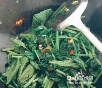 放蒜炒至金黄时放入菠菜,大火翻炒。