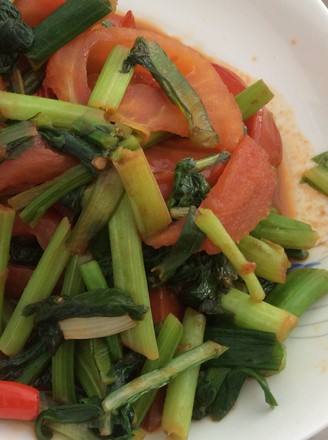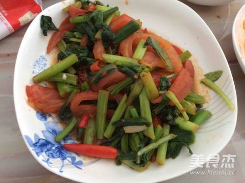 油中放小红辣椒,出味儿,然后先放菜心,再放西红柿,翻炒~