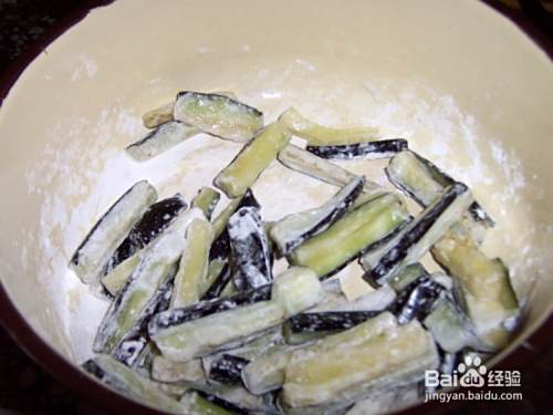 腌制好的茄子条挤去水分,加入淀粉拌均。让茄子都能够均匀沾满干淀粉。