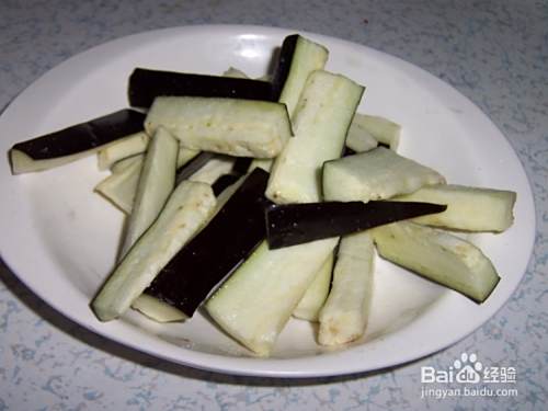 茄子洗净切成条,加入少量的盐抓匀腌制10分钟