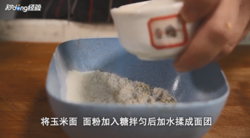 将玉米面,面粉加入糖拌匀后,加水揉成面团。