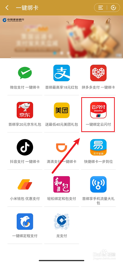 在一键绑卡菜单中选择点击【一键绑定云闪付】选项即可(如图所示)