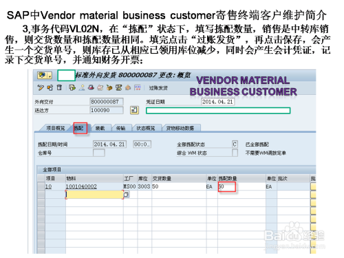 事务代码VL02N,在“拣配”状态下,填写拣配数量,销售是中转库销售,则交货数量和拣配数量相同。填完点击“过账发货”,再点击保存,会产生一个交货单号,则库存已从相应已领用库位减少,同时会产生会计凭证,记录下交货单号,并通知财务开票;