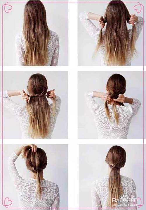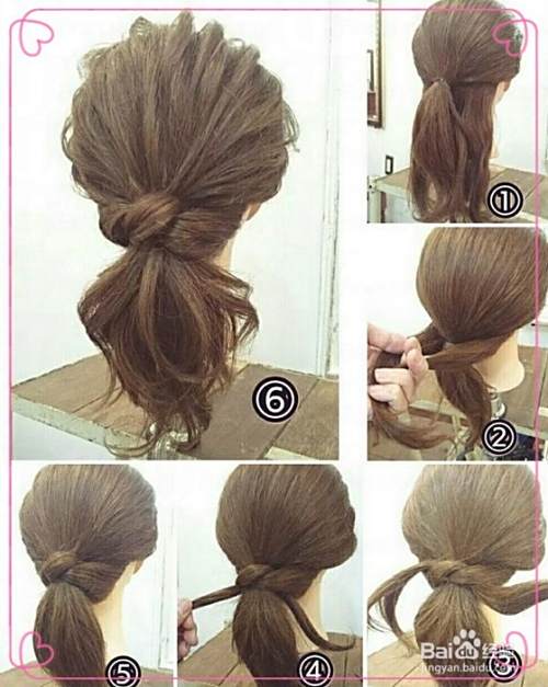长发如果不想让它披散在肩上的,那么还可以将它扎成这样的造型——打结马尾,(步骤如上图所示)方法简单,自己在家也可以独立完成,而且这款打结马尾还可以带来一定的时尚减龄气息,不会显央选得过于的单调。