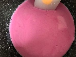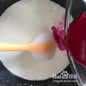 奶粉慢慢加入温水中,一边搅拌一边加,直到奶粉完全溶解,再加入玉米淀粉、细砂糖和炼乳搅匀,倒入火龙果汁