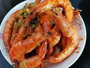 热锅冷油,葱蒜香芹爆香,放入大虾复炒1—2分钟