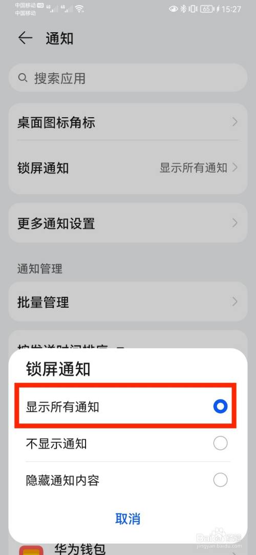 在华为手机上,通过手机通知设置开启手机锁屏显示所有通知开关的方法。