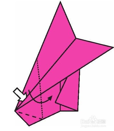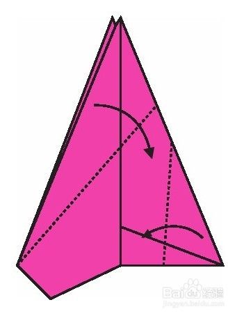 先将右角沿虚线向箭头方向折,再将前面部分沿虚线向下折。