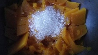 将南瓜蒸出来的水汽倒掉,趁热加入白糖,用勺子边压边拌,捣成南瓜泥。