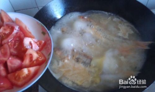 当汤色变成奶白色时,加入蕃茄一起炖煮。