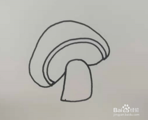第四步,我们这里要画出蘑菇的茎部,在刚刚画好的蘑菇伞的下面,画上一个上窄下粗的圆柱体,具体可以参考下图。