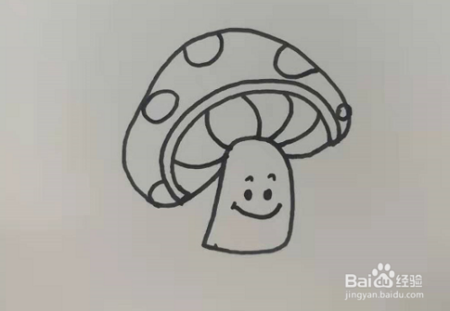 第八步,我们可以在蘑菇的茎上画上一个笑脸,这样会更加可爱一些哦,用黑点代表眼睛,然后画上微笑的嘴,如下图所示。