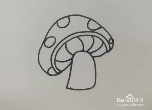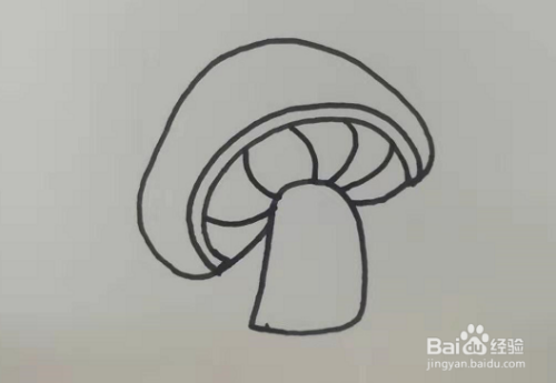 第六步,我们要画出蘑菇小伞中的褶皱,用弧线来表示,注意分割的空间尽量平均,这样会比较好看,如下图所示。